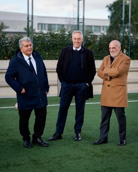 巴塞罗那足球俱乐部主席拉波尔塔与西甲联盟主席特巴斯,共同欢迎由中国国务委员谌贻琴率领的中国代表团访问巴萨拉玛西亚青训营。
