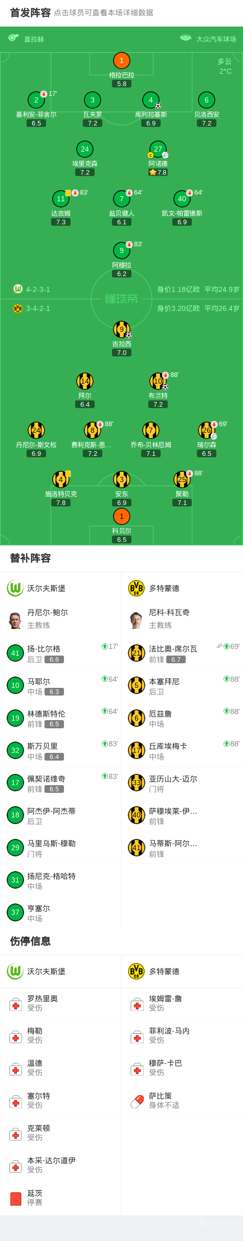 北京时间2月7日德国足球顶级联赛 联赛 第21轮,沃尔夫斯堡主场对阵多特蒙德,本次比赛阿穆拉屡失良机。上半场瑞尔森开出角球,布兰特头球破门。下半场阿诺德开出任意球,库列拉基斯头球破门,比赛尾声恩梅加带球推进后传球,席尔瓦助攻吉拉西绝杀。最终多特2-1客胜沃尔夫斯堡。