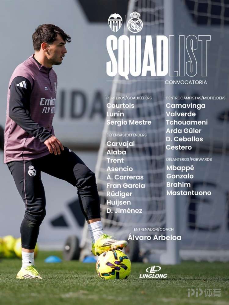 北京时间明天凌晨,皇马将在西甲第23轮比赛中客场对阵瓦伦西亚,皇马公布了此役的球员名单。吕迪格、阿诺德回归,贝林厄姆、维尼修斯(停赛)、罗德里戈、米利唐、门迪缺席。