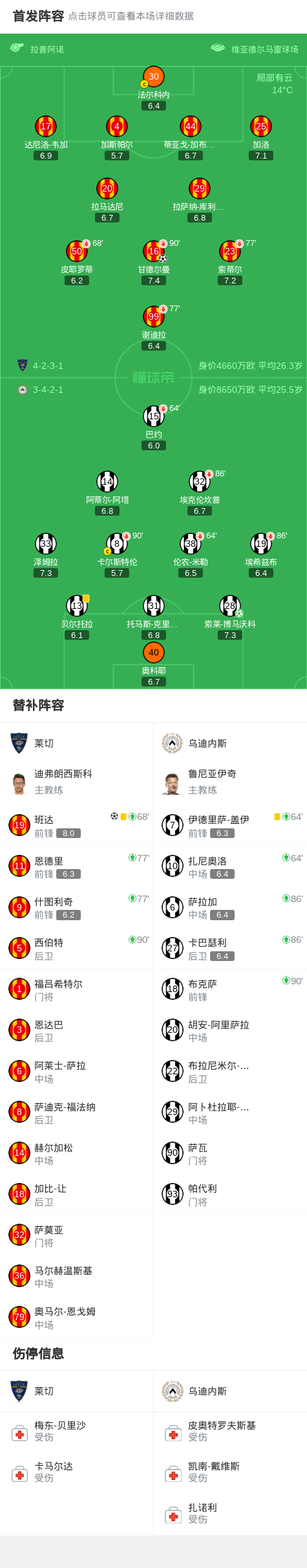 第26分钟,乌迪内斯球员索莱-博马沃科罚入点球。