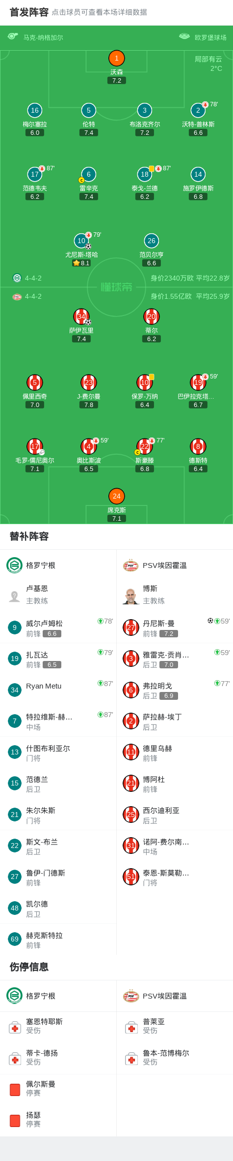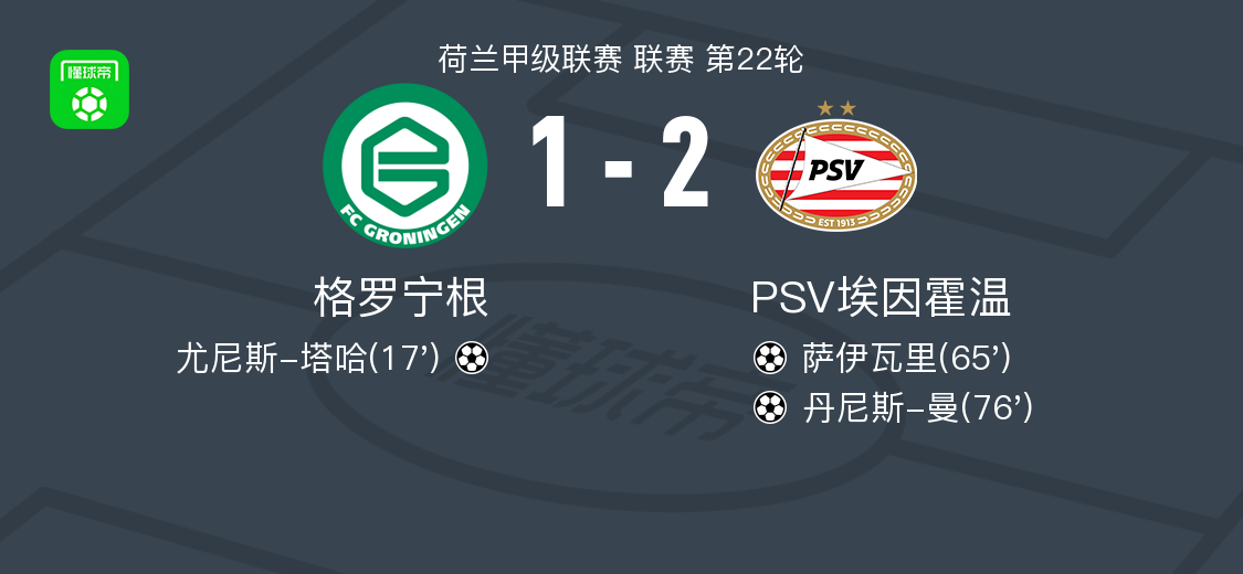北京时间2月8日荷兰甲级联赛 联赛 第22轮,格罗宁根主场对阵PSV埃因霍温。格罗宁根尤尼斯-塔哈破门。PSV埃因霍温萨伊瓦里破门,丹尼斯-曼破门。最终比分格罗宁根 1-2 PSV埃因霍温。