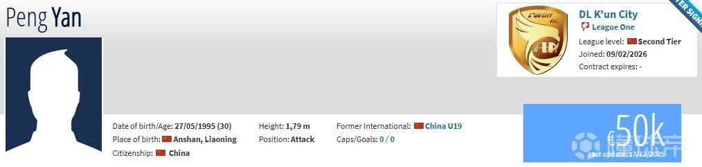 在2025赛季结束后,闫鹏与大连英博合同到期。现在他在德转上的身价为5万欧元。