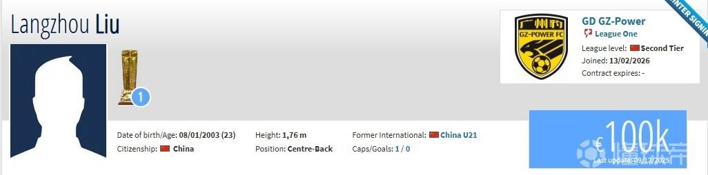 北京时间2月13日,德转更新,原广州队、青岛西海岸后卫刘浪舟加盟广东广州豹。