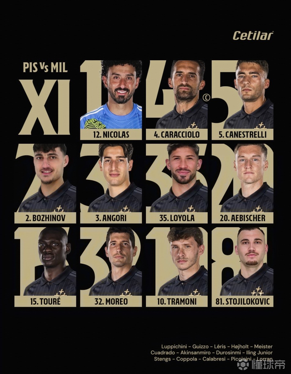 比萨首发:12-尼古拉斯、2-博日诺夫、5-卡内斯特雷利、4-卡拉乔洛、3-安戈里、35-费利佩-洛约拉、10-特拉莫尼、20-埃贝彻尔、15-伊德里萨-图雷、81-斯托伊科维奇、32-莫雷奥
